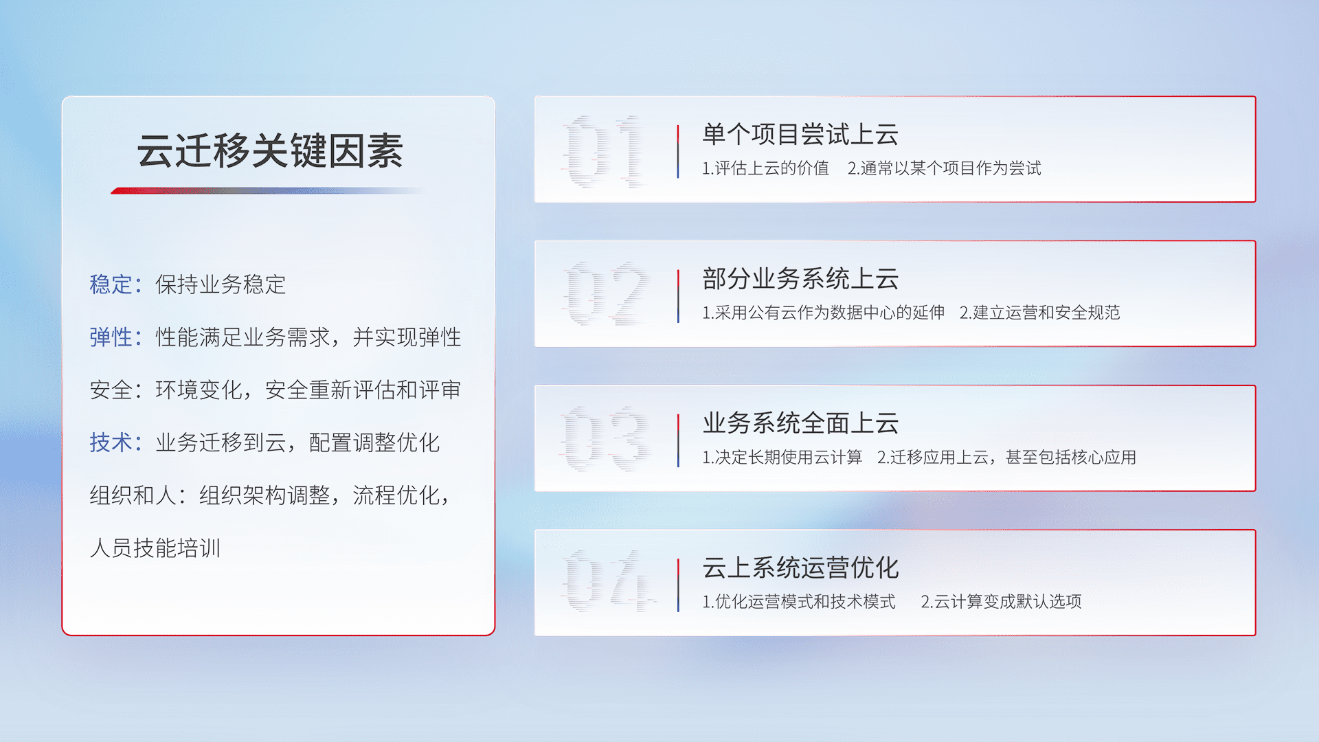 结合实际业务,,从规划设计、、云平台选型、、、、云原生改造、、、、数据迁移、、、、集成交付,,,迁移全过程为客户识别最佳上云路径,,,做好风险识别管理,,,设计网络架构、、身份权限、、、安全审计合规、、、、操作审计、、日志审计、、、监控告警策略、、、、多站点容灾设计等,,对云上基础设施进行整体规划,,,,提升IT治理水平,,,,以满足弹性、、高可用、、、、高性能的需求。。